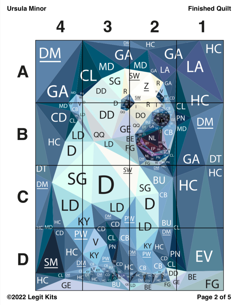 A Polar Bear cub emerges with a roar. Ursula Minor, is a premium design with everything a foundation paper piece quilter could want. Designed with bright, wintry colors, this quilt top kit will make a fabulous wall hanging art piece, baby quilt, or surround this design with complimentary fabric to create a stunning full sized quilt top. This kit contains color maps, fabric lists, an assembly guide, the full pattern printed on foundation paper, and ample cuts of 41 different shades of Robert Kaufman Kona Cotton Solids to complete this medium sized, 30 inch wide by 40 inch long quilt top.