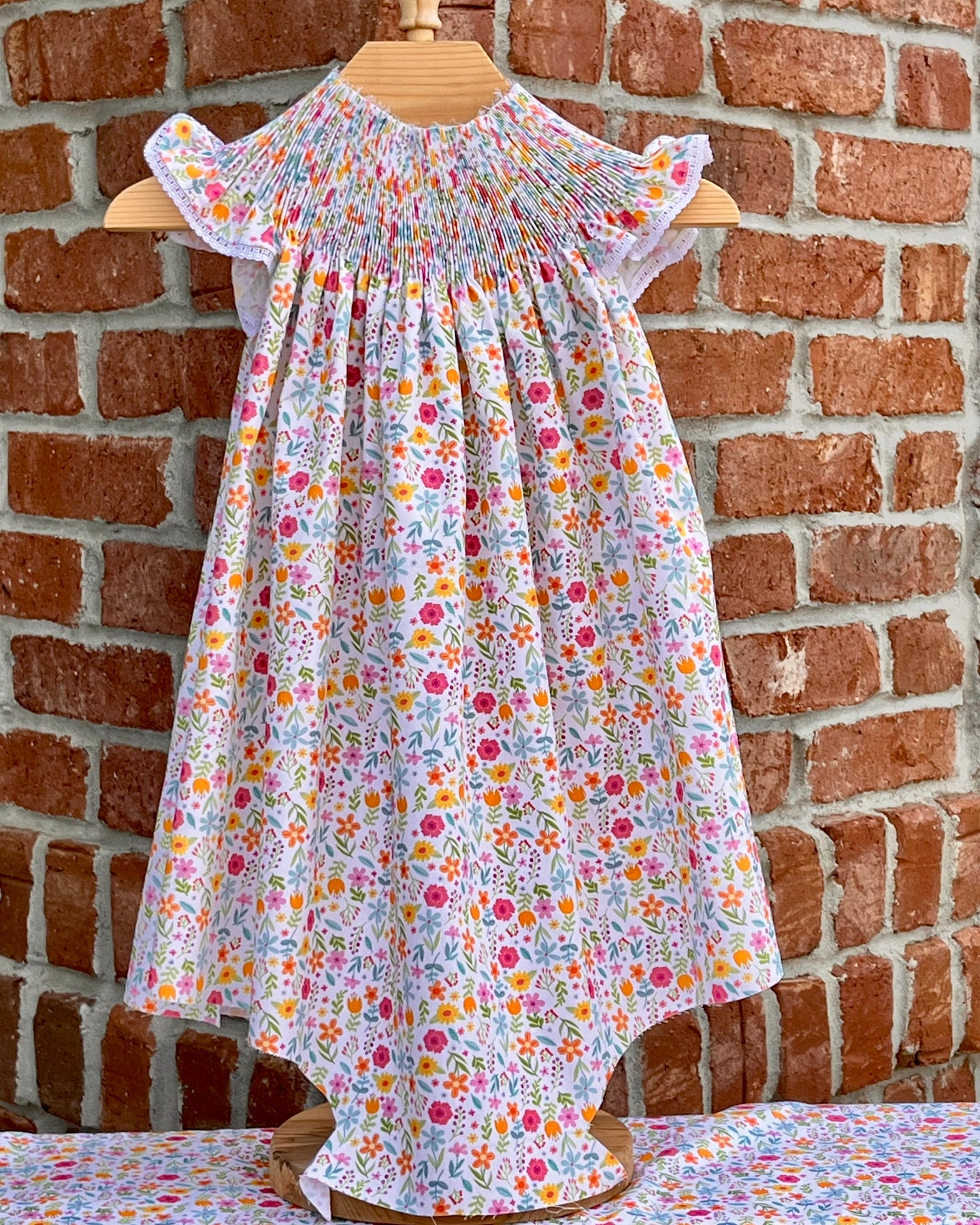 An angel sleeve bishop bubble or bishop dress is the perfect choice for the hot summer days ahead. Our bishop is made of a fun, bright, summery floral 100% cotton broadcloth from Fabric Finders. Delicate Swiss trim finishes the edge of the angel sleeve. For your convenience, we have included a cut strip of fabric for the continuous bound placket, and bias for the neckband and underarm. Just trim to fit your needs.