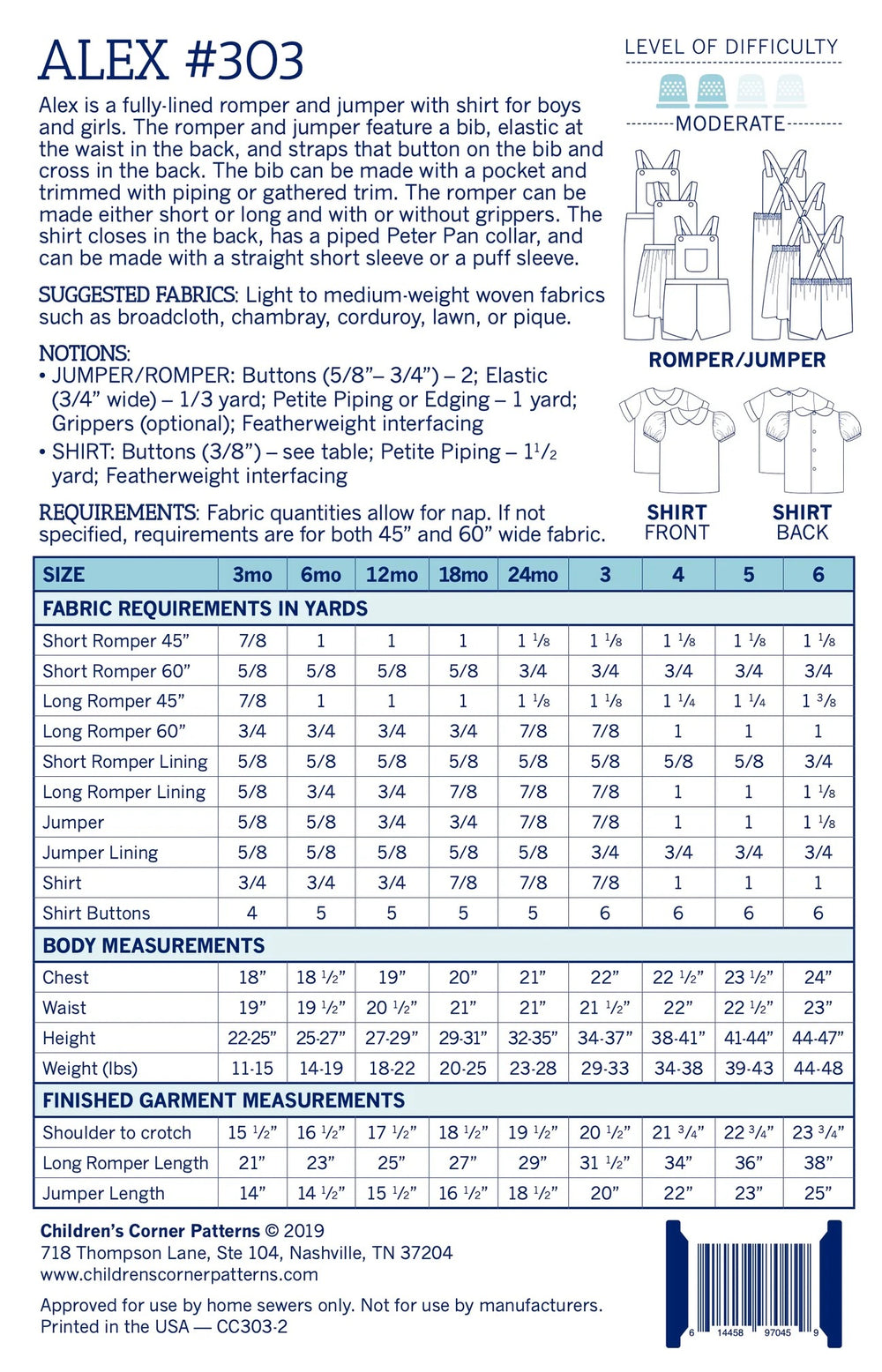 Alex is a fully-lined romper and jumper with shirt for boys and girls. The romper and jumper feature a bib, elastic at the waist in the back, and straps that button on the bib and cross in the back. The bib can be made with a pocket and trimmed with piping or gathered trim. The romper can be made either short or long and with or without grippers. The shirt closes in the back, has a piped Peter Pan collar, and can be made with a straight short sleeve or a puff sleeve.