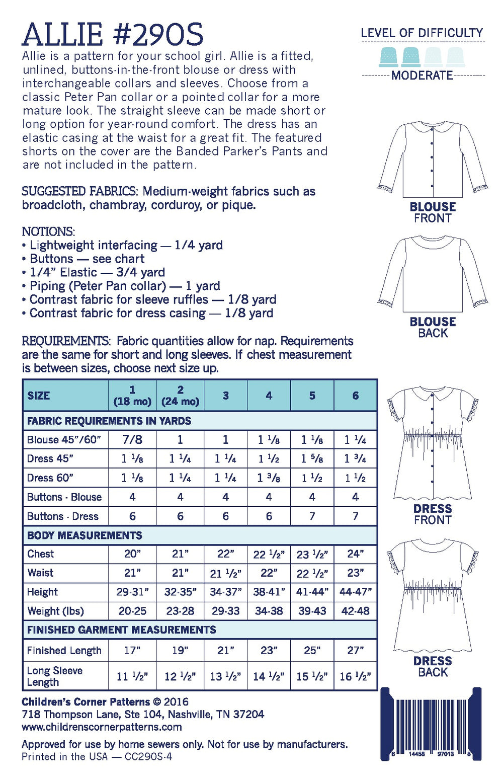 Allie is a pattern for your school girl. Allie is a fitted, unlined, buttons-in-the-front blouse or dress with interchangeable collars and sleeves. Choose from a classic Peter Pan collar or a pointed collar for a more mature look. The straight sleeve can be made short or long option for year-round comfort. The dress has an elastic casing at the waist for a great fit. The featured shorts on the cover are the Banded Parker's Pants and are not included in the pattern.