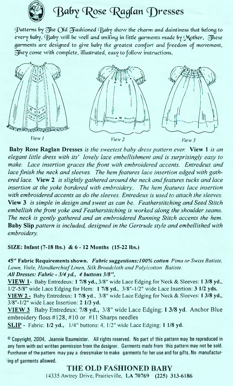 Baby Rose Raglan Dresses is the sweetest baby dress pattern ever. View 1 is an elegant little dress w/its lovely lace embellishment & is surprisingly easy to make. Lace insertion graces the front w/embroidered accents. Entredeux & lace finish the neck & sleeves. The hem features lace insertion edged w/ gathered lace. View 2 is slightly gathered around the neck & features tucks & lace insertion at the yoke bordered w/embroidery. The hem features lace insertion w/embroidered accents as do the sleeves. Entredeux is used to attach the sleeves. View 3 is simple in design and sweet! Featherstitching & seed stitch embellish the front yoke & featherstitching is worked along the shoulder seams. The neck is gently gathered and an embroidered running stitch accents the hem. Baby slip pattern is included, designed in the Gertrude style (A-line, button at the shoulder) & embellished with embroidery. FABRIC REQUIREMENT: All Dresses - 3/4 yard. Slip requires 1/2 yard.