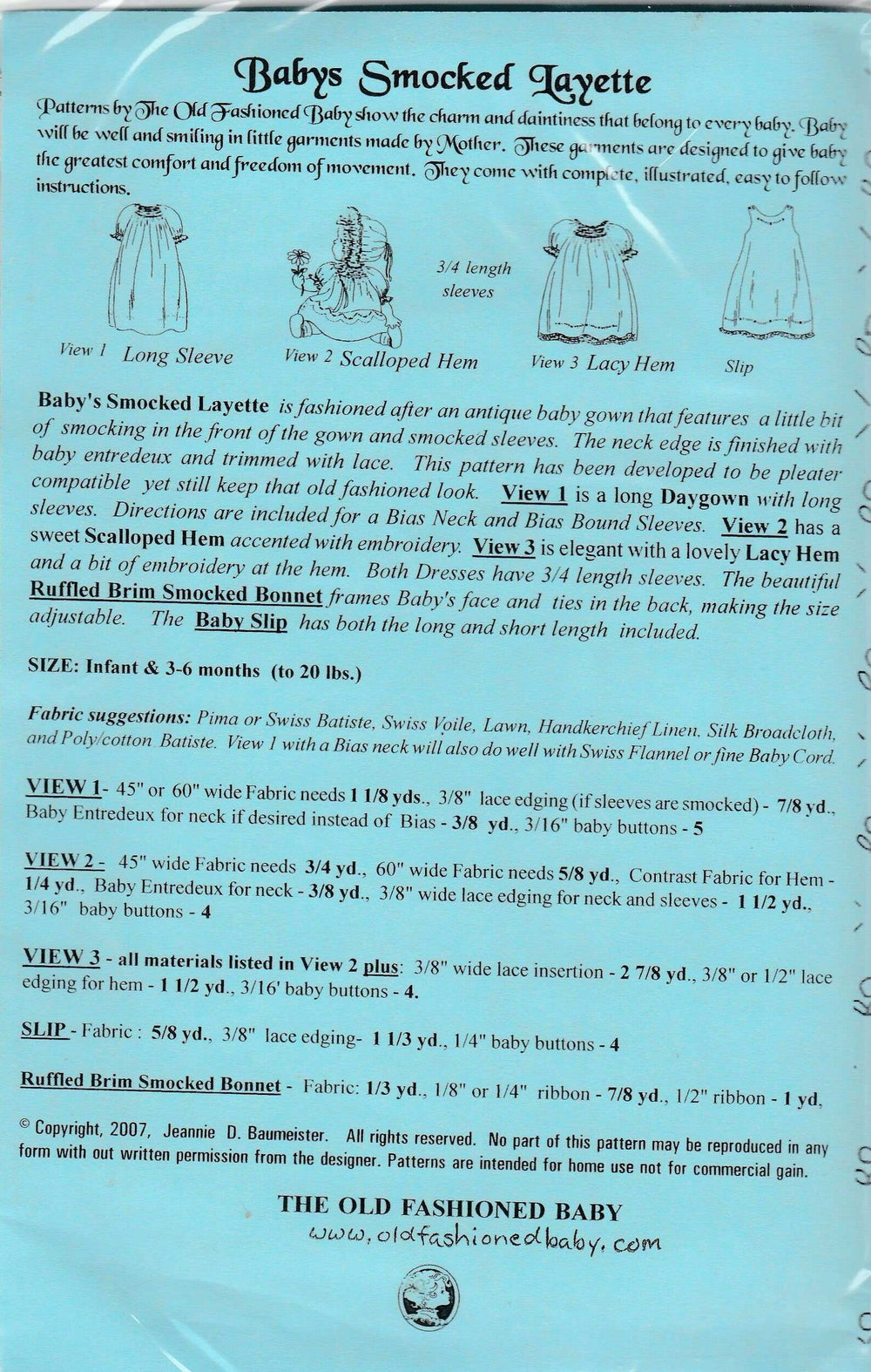 This is a wonderful pattern for anyone who loves to smock or wants to learn. The pattern is pleater compatible and includes instructions for pleating and smocking. There is a small amount of smocking at the neck and sleeves accented with bullion rosebuds. This pattern was fashioned after an antique and has that old fashioned look that is hard to achieve with most smocked  garments. There is a long daygown with long sleeves and a bias neck which is perfect for boys or girls. The short daydress has 3/4 length sleeves and your choice of a lacy hem or a Madeira scalloped hem. The neck is finished with entredeux and lace. All garments button down the back. Includes ruffled brim smocked bonnet and slip pattern.