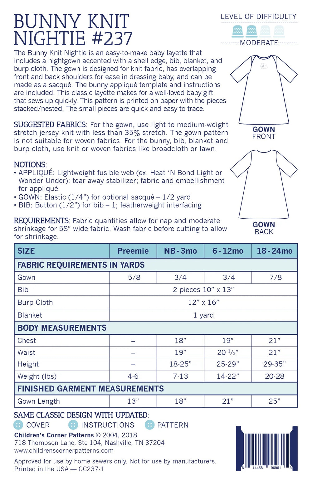 The Bunny Knit Nightie is an easy-to-make baby layette that includes a nightgown accented with a shell edge, bib, blanket, and burp cloth. The gown is designed for knit fabric, has overlapping front and back shoulders for ease in dressing baby, and can be made as a sacqué. The bunny appliqué template and instructions are included. This classic layette makes for a well-loved baby gift that sews up quickly. This pattern is printed on paper with the pieces stacked/nested. The small pieces are quick and easy to trace.