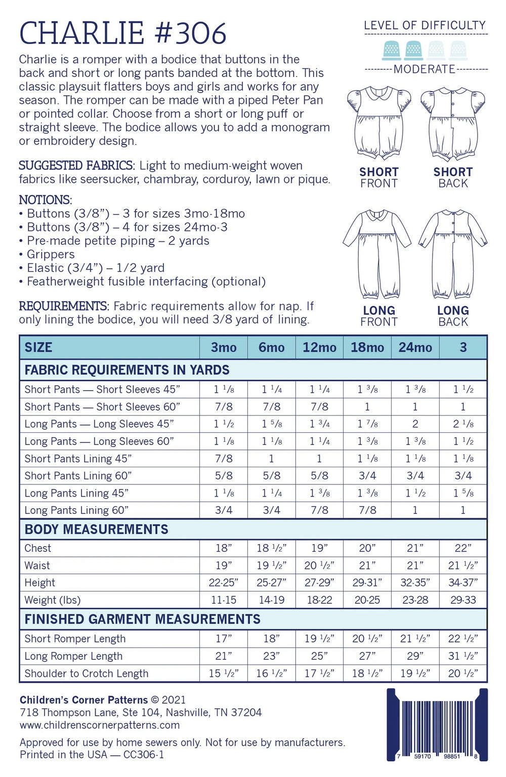 Charlie is a romper with a bodice that buttons in the back and short or long pants banded at the bottom. This classic playsuit flatters boys and girls and works for any season. The romper can be made with a piped Peter Pan or pointed collar. Choose from two different sleeves that can be made short or long. The bodice allows you to add a monogram or embroidery design.