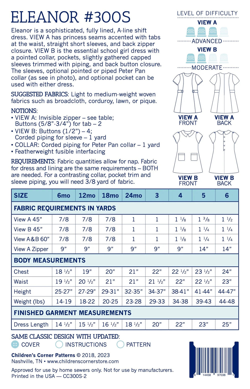 Eleanor is a sophisticated, fully lined, A-line shift dress. VIEW A has princess seams accented with tabs at the waist, straight short sleeves, and back zipper closure. VIEW B is the essential school girl dress with a pointed collar, pockets, slightly gathered capped sleeves trimmed with piping, and back button closure. The sleeves, optional piped Peter Pan or pointed collar, and optional pocket can be used with either dress.