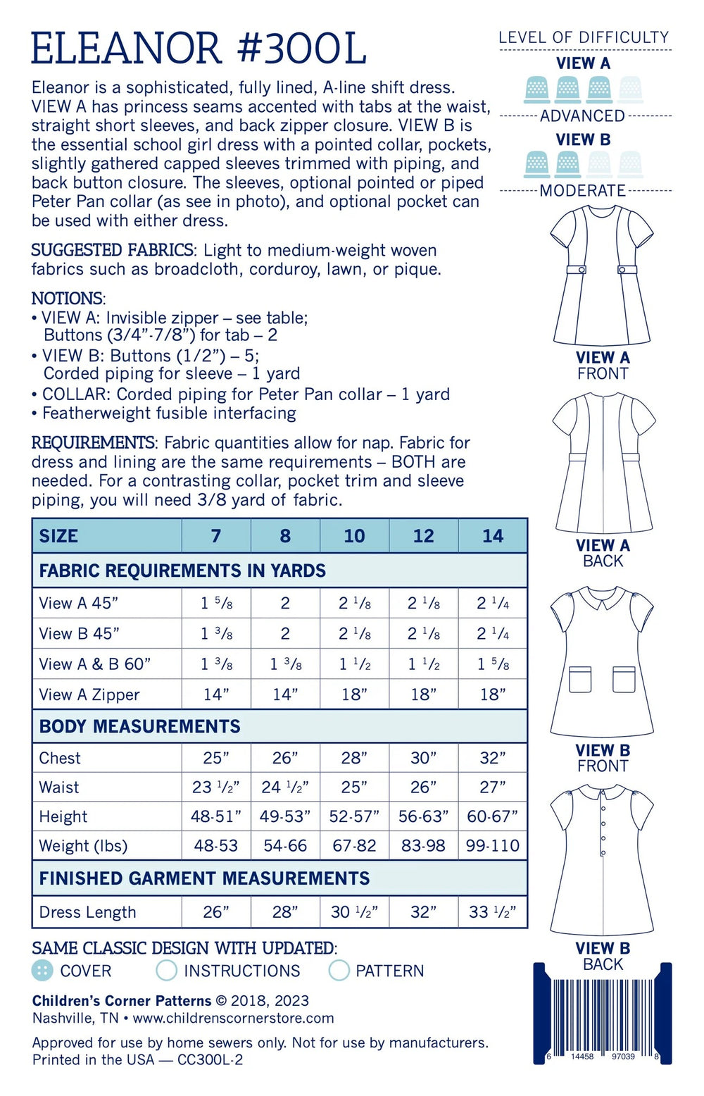 Eleanor is a sophisticated, fully lined, A-line shift dress. VIEW A has princess seams accented with tabs at the waist, straight short sleeves, and back zipper closure. VIEW B is the essential school girl dress with a pointed collar, pockets, slightly gathered capped sleeves trimmed with piping, and back button closure. The sleeves, optional piped Peter Pan or pointed collar, and optional pocket can be used with either dress.