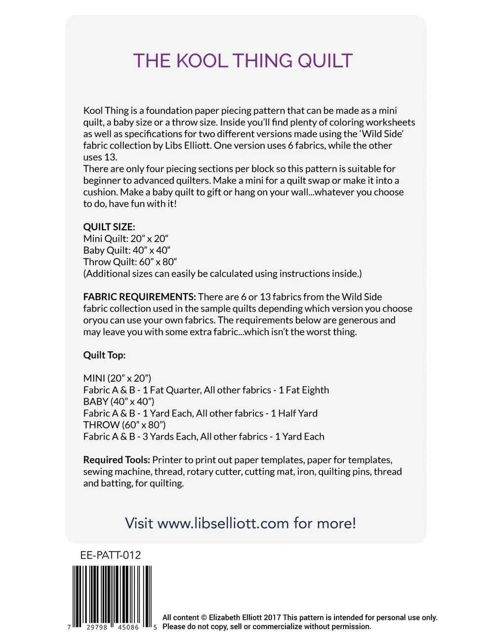 Kool Thing is a foundation paper piecing pattern that can be made as a mini quilt, a baby size or a throw size. Inside you’ll find plenty of coloring worksheets as well as specifications for two different versions made using the ‘Wild Side’ fabric collection by Libs Elliott.