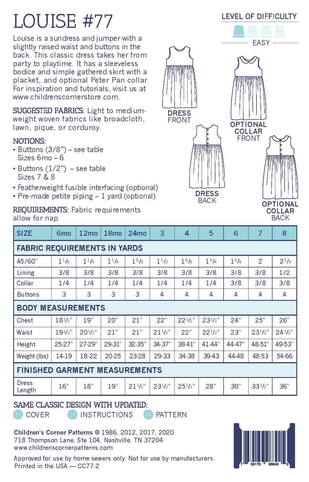 Louise is a sundress and jumper with a slightly raised waist and buttons in the back. This classic dress takes her from party to playtime. It has a sleeveless bodice and simple gathered skirt with a placket and optional Peter Pan collar. This is a complete pattern update of the original pattern.