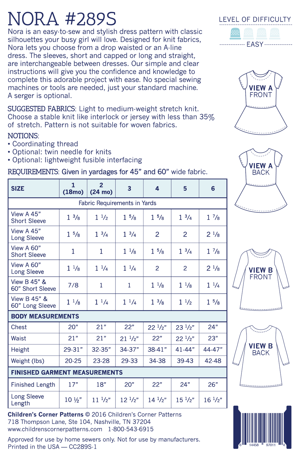 Nora is an easy-to-sew and stylish dress pattern with classic silhouettes your busy girl will love. Designed for knit fabrics, Nora lets you choose from a drop waisted or an A-line dress. The sleeves, short and capped or long and straight, are interchangeable between dresses. Our simple and clear instructions will give you the confidence and knowledge to complete this adorable project with ease. No special sewing machines or tools are needed, just your standard machine. A serger is optional.