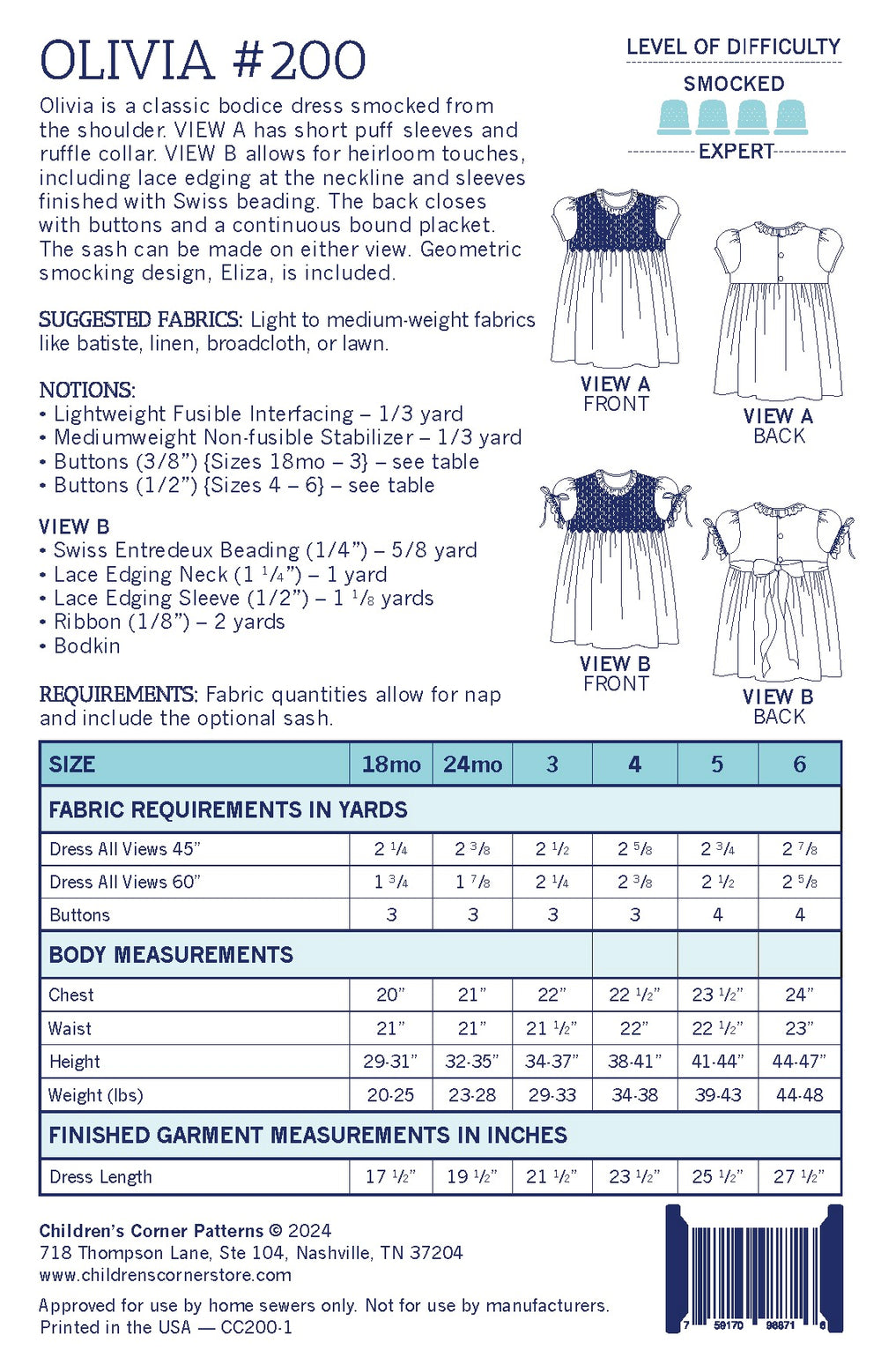 Olivia is a classic bodice dress smocked from the shoulder. VIEW A has short puff sleeves and ruffle collar. VIEW B allows for heirloom touches, including lace edging at the neckline and sleeves finished with Swiss beading. The back closes with buttons and a continuous bound placket. The sash can be made on either view. Geometric smocking design, Eliza, is included.