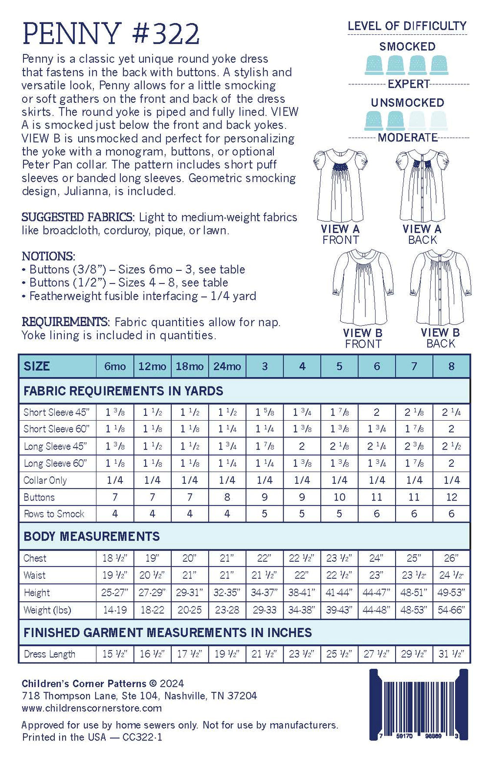 Penny is a classic yet unique round yoke dress that fastens in the back with buttons. A stylish and versatile look, Penny allows for a little smocking or soft gathers on the front and back of the dress skirts. The round yoke is piped and fully lined. VIEW A is smocked just below the front and back yokes. VIEW B is unsmocked and perfect for personalizing the yoke with a monogram, buttons, or optional Peter Pan collar. The pattern includes short puff sleeves or banded long sleeves. Geometric smocking design, Julianna, is included.