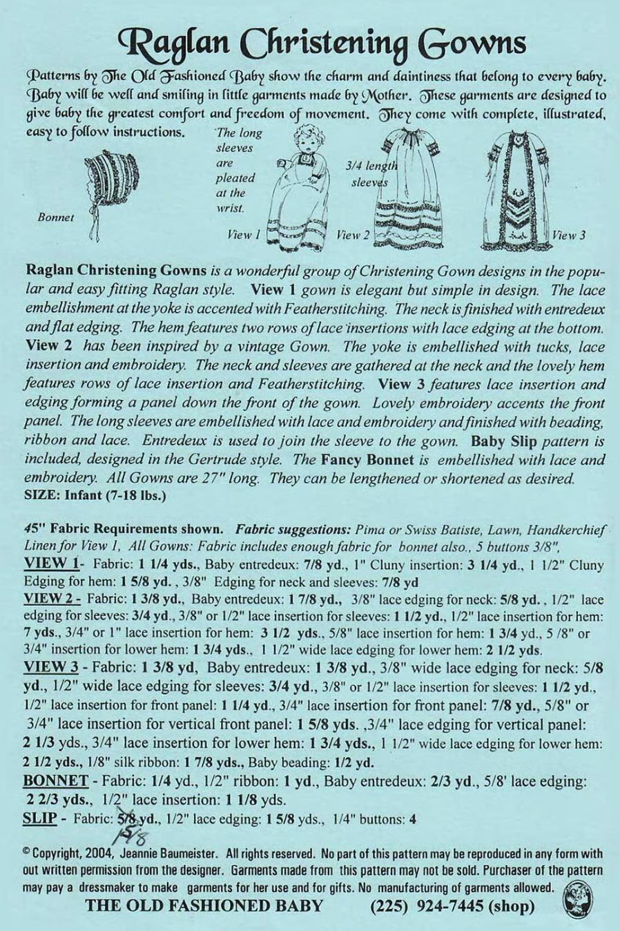Raglan Christening Gowns is a wonderful group of Christening Gown Designs in the popular and easy fitting Raglan style. View 1 gown is elegant but simple in design. The lace embellishment at the yoke is accented w/featherstitching. The neck is finished w/entredeux & flat edging. The hem features 2 rows of lace insertion w/lace edging at the bottom. View 2 - Inspired by a vintage gown. The yoke is embellished w/tucks, lace insertion & embroidery. The neck & sleeves are gathered & the hem features rows of lace insertion & featherstitching. View 3 - features lace insertion & edging forming a panel down the front of the gown. Lovely embroidery accents the front panel. The long sleeves are embellished with lace & embroidery & finished w/beading, ribbon & lace. Entredeux is used to join the sleeve to the gown. Baby Slip pattern is included, designed in the Gertrude style (A-line, button shoulder). Fancy Bonnet is embellished w/lace & embroidery. All gowns are 27" long. They can be lengthened or shortened as desired. FABRIC REQUIREMENT: View 1 - 1 1/4 yard View 2 & 3 - 1 3/8 yards Bonnet Fabric - 1/4 yard Slip Fabric - 1 5/8 yard