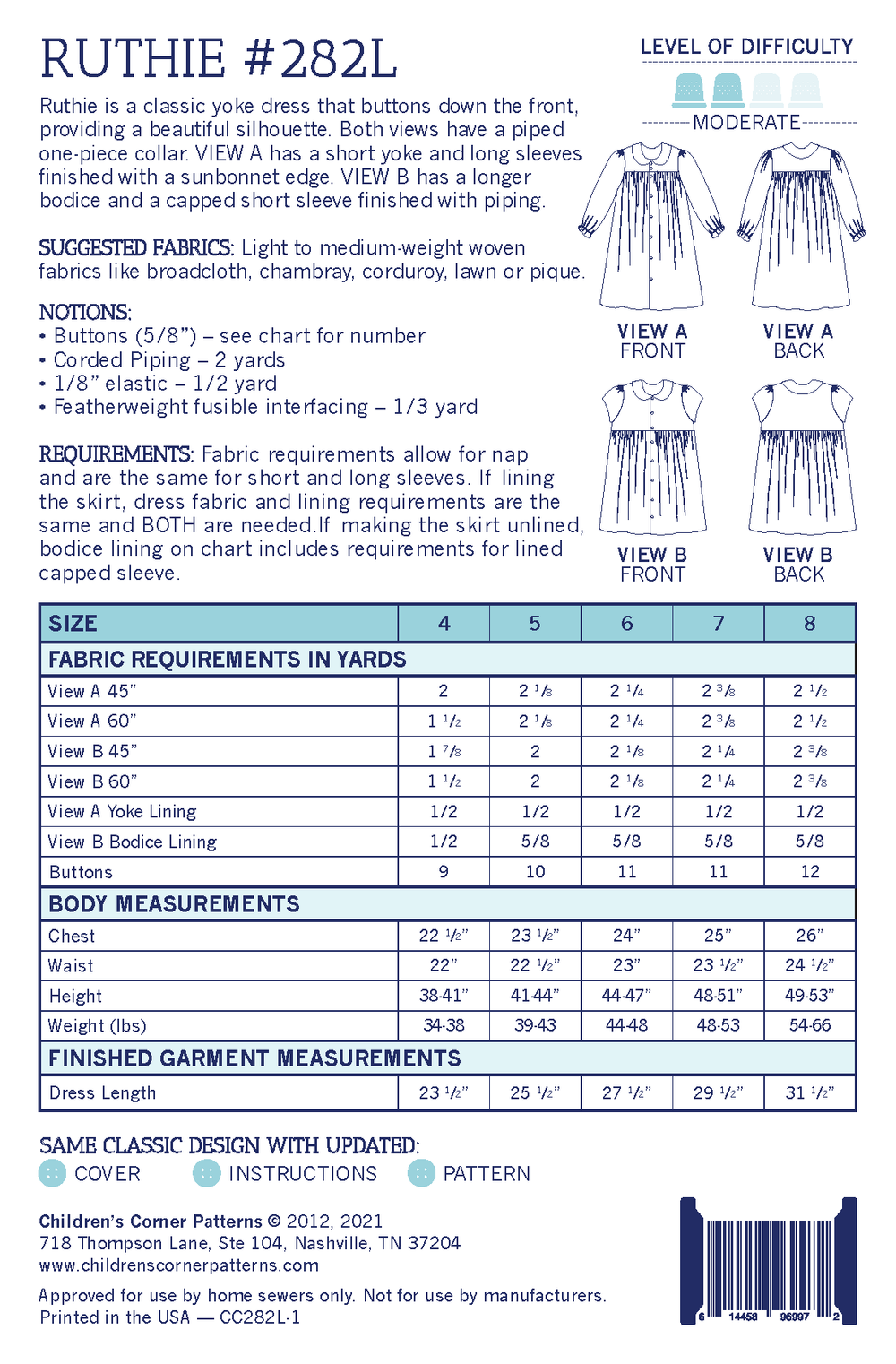 Ruthie is a classic Children's Corner yoke dress that buttons down the front, providing a beautiful silhouette. Both views have a piped one-piece collar. View A has a short yoke and long sleeves finished with a sunbonnet edge. View B has a longer yoke and a capped short sleeve finished with piping. Includes Sizes 4 - 8.