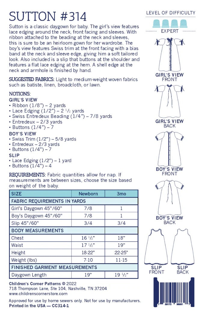 Sutton is a classic daygown for baby. The girl’s view features lace edging around the neck, front facing and sleeves. With ribbon attached to the beading at the neck and sleeves this is sure to be an heirloom gown for her wardrobe. The boy’s view features Swiss trim at the front facing with a bias band at the neck and sleeve edge giving him a soft tailored look. Also included is a slip that buttons at the shoulder and features a flat lace edging at the hem. A shell edge at the neck and armhole is finished by hand.