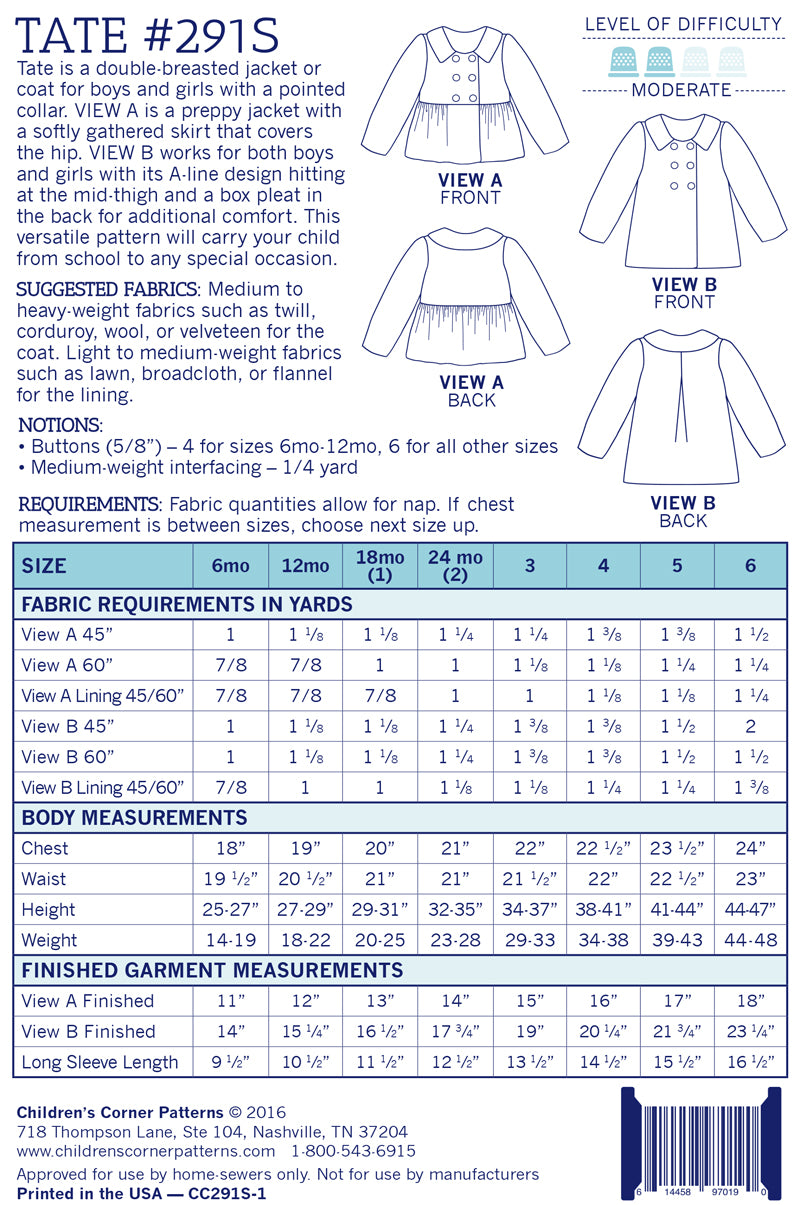 Tate is a double-breasted jacket or coat for boys and girls with a pointed collar. View A is a preppy jacket with a softly-gathered skirt that covers the hip. View B works for both boys and girls with its A-line design hitting at the mid-thigh and a box pleat in the back for additional comfort. This versatile pattern will carry your child from school to any special occasion.