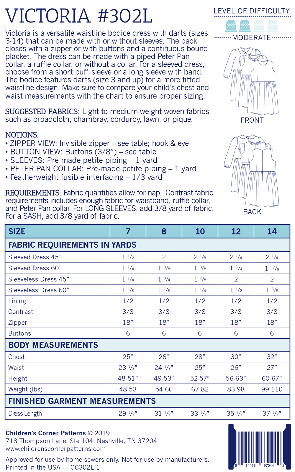 Victoria is a versatile waistline bodice dress that can be made with or without sleeves. The back closes with a zipper or with buttons and a continuous bound placket. The dress can be made with a piped Peter Pan collar, a ruffle collar, or without a collar. For a sleeved dress, choose from a short puff sleeve or a long sleeve with band. The bodice features darts (size 3 and up) for a more fitted waistline design. The waist is accented by a waistband or a sash. Make sure to compare your child’s measurements with the chart to ensure proper sizing.