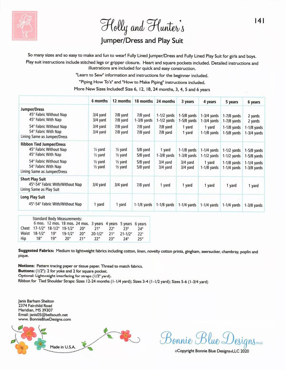 Pattern sheet for Holly and Hunter's Jumper/Dress and Play Suit with size chart and fabric requirements.