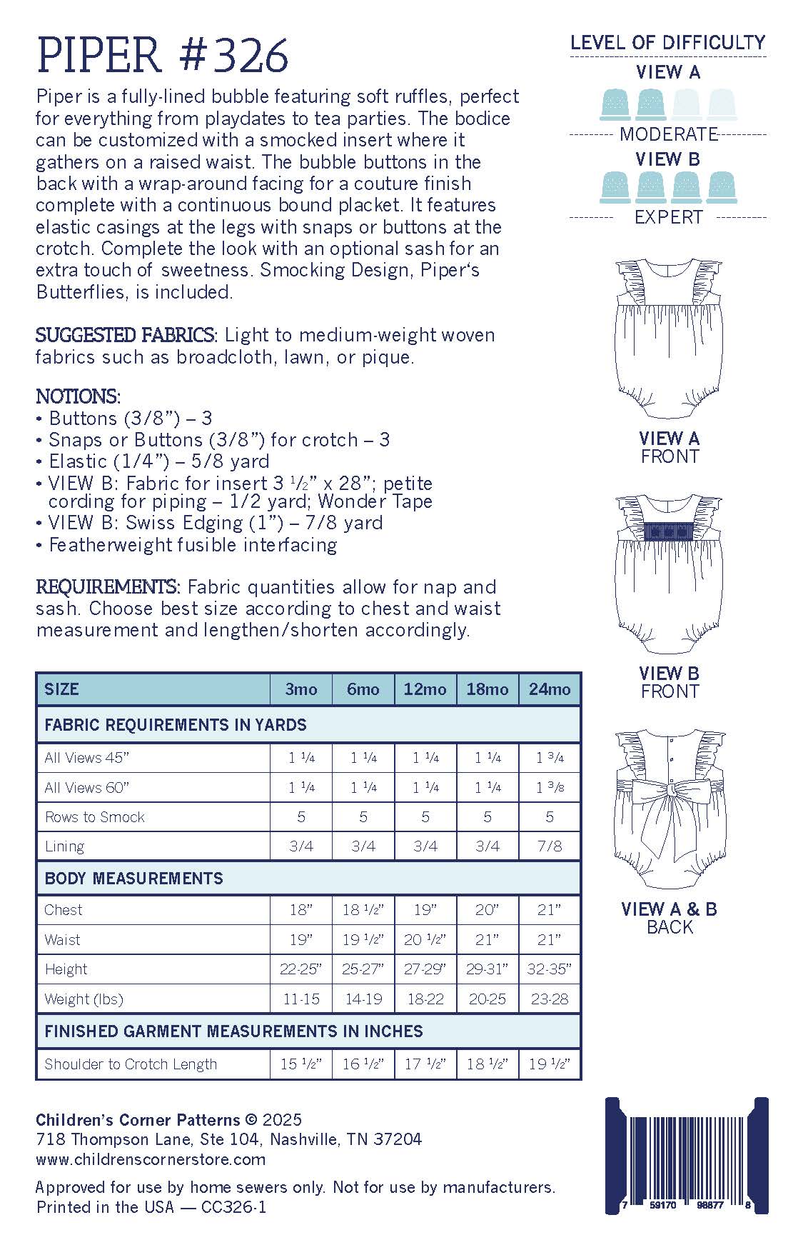 Piper is a fully-lined bubble featuring soft ruffles, perfect for everything from playdates to tea parties. The bodice can be customized with a smocked insert where it gathers on a raised waist. The bubble buttons in the back with a wrap-around facing for a couture finish complete with a continuous bound placket. It features elastic casings at the legs with snaps or buttons at the crotch. Complete the look with an optional sash for an extra touch of sweetness. Smocking Design, Piper's Butterflies, is included.