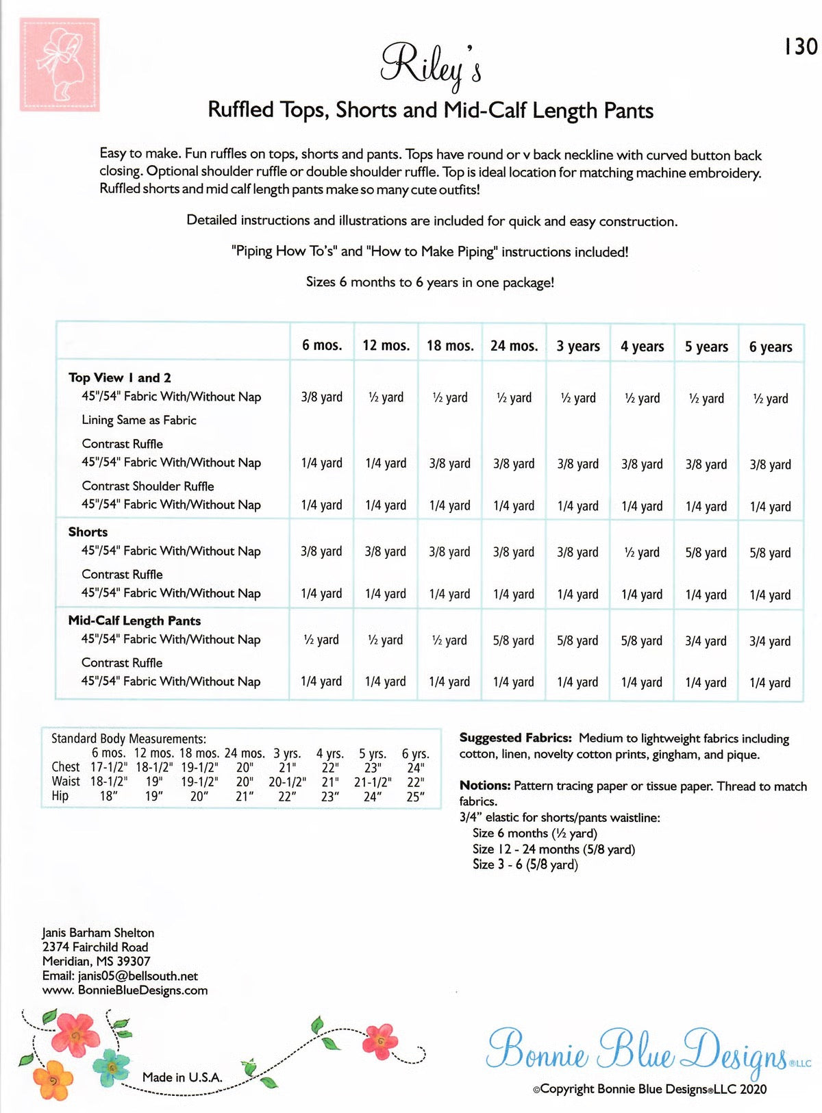 "Riley", Ruffled Tops, Shorts & Pants - sizes 6, 12, 18, & 24 Months and 3,4,5 and 6 years included. Easy to make. Fun ruffles on tops, short & pants. Tops have round or V-back neckline w/curved button back closing. Opt. shoulder ruffle or double shoulder ruffle. Top is ideal for applique or machine embroidery. Ruffled shorts or mid-calf pants make so many cute outfits!!