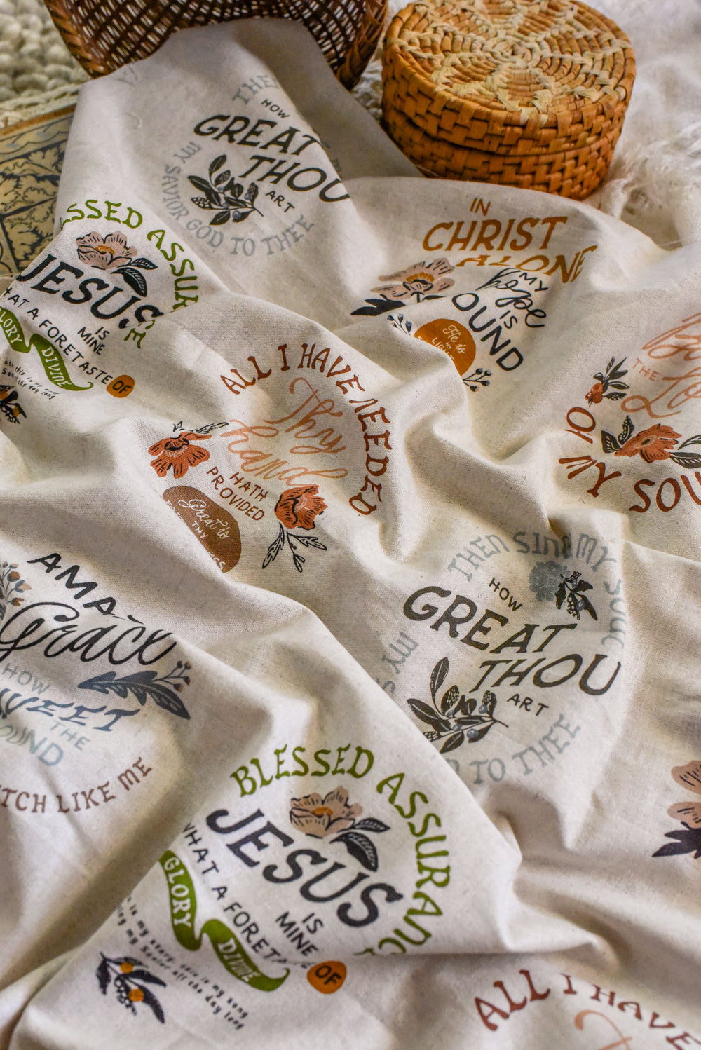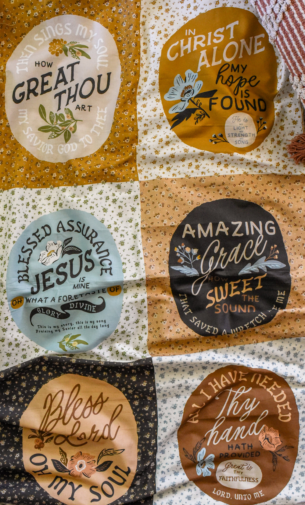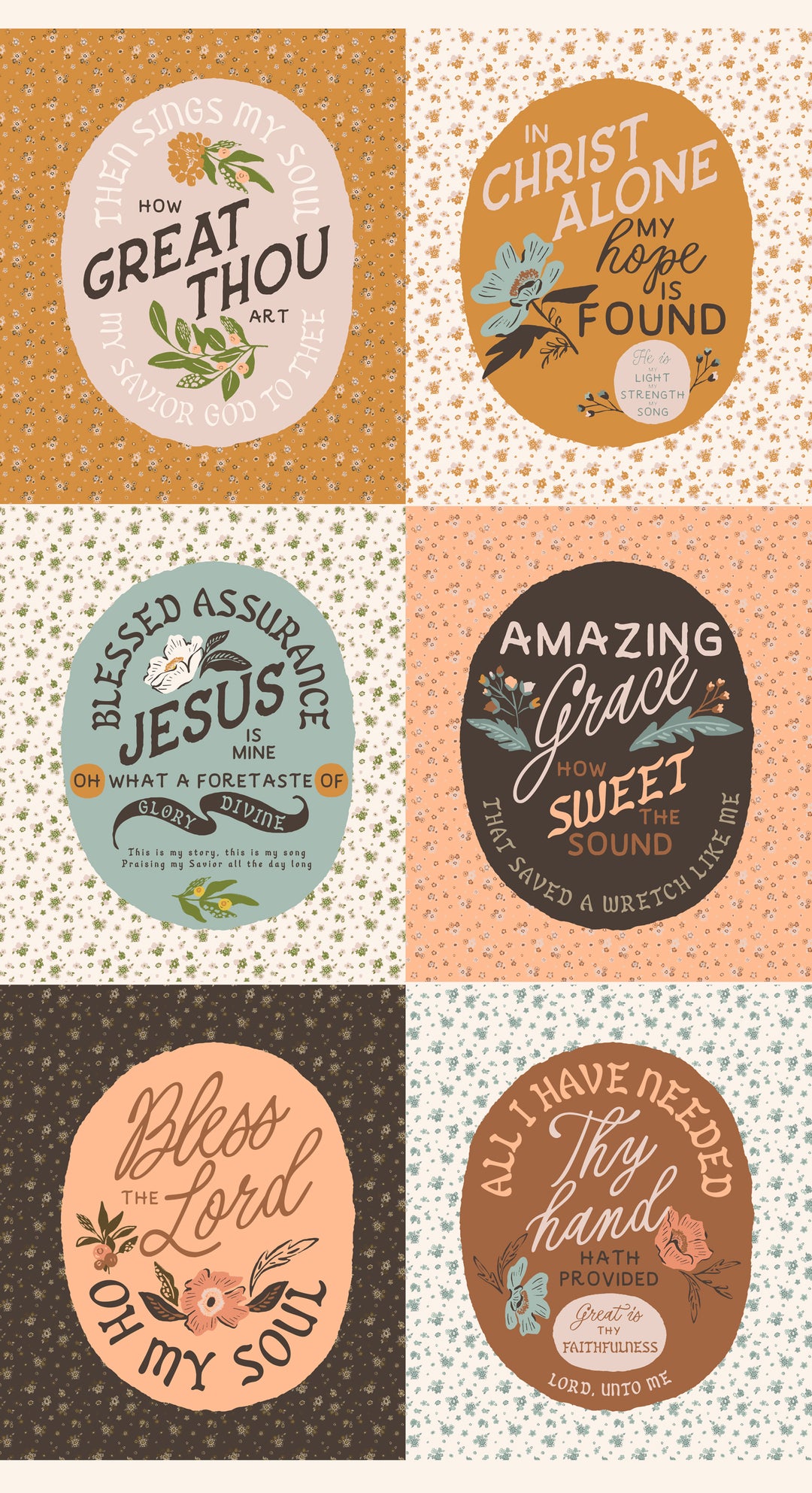 A standout feature of Wellspring is its inspirational fabric panels, which showcase meaningful Christian hymns and religious sayings beautifully framed with hand-drawn florals and elegant typography. These panels are perfect for creating statement quilt blocks, wall hangings, pillows, and other faith-filled projects that share messages of hope, grace, and gratitude.