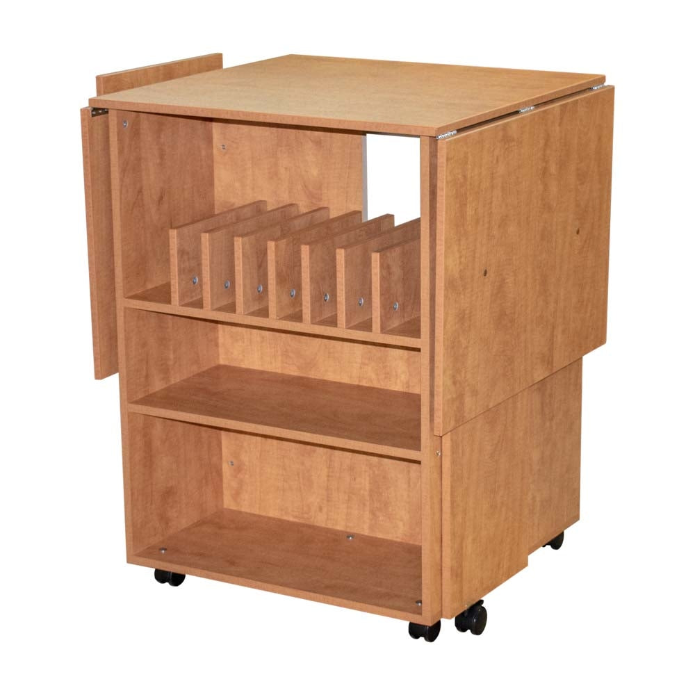 Model A680 is a multi-use cutting cabinet offering storage and work space. It's built specifically for fabric cutters and features two drop leaves for plenty of work space, shelves for storage, and dividers for organizing dyes.